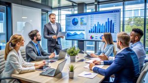 Business people in a meeting, discussing financial data.